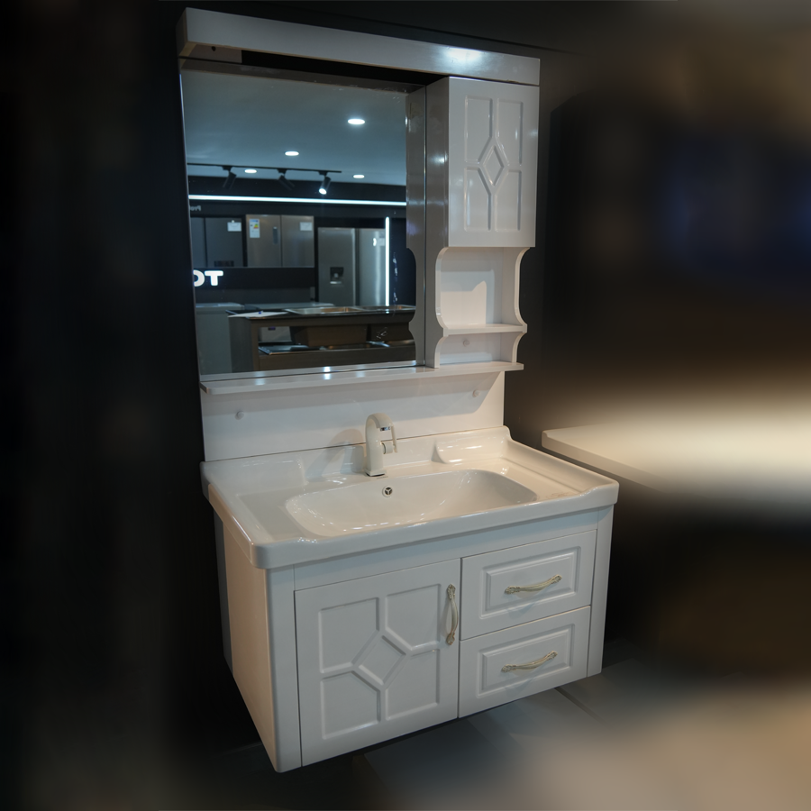 Functional PVC bathroom cabinet offering practical storage solutions with water-resistant construction. Features durable PVC materials engineered for bathroom environments. Provides ample storage capacity with clean, modern design lines. Ideal for cost-effective bathroom renovations requiring reliable, moisture-resistant cabinetry.